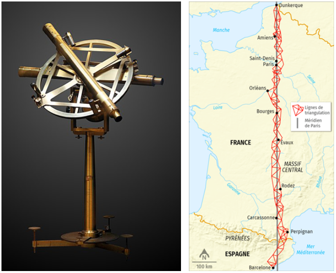 À esquerdam, Círculo Repetidor de Borda. À direita, linhas das triangulações (em vermelho) para medição do trecho do meridiano (em cinza) que passa por Paris – Fonte: Association Française pour L’Avancement des Sciences