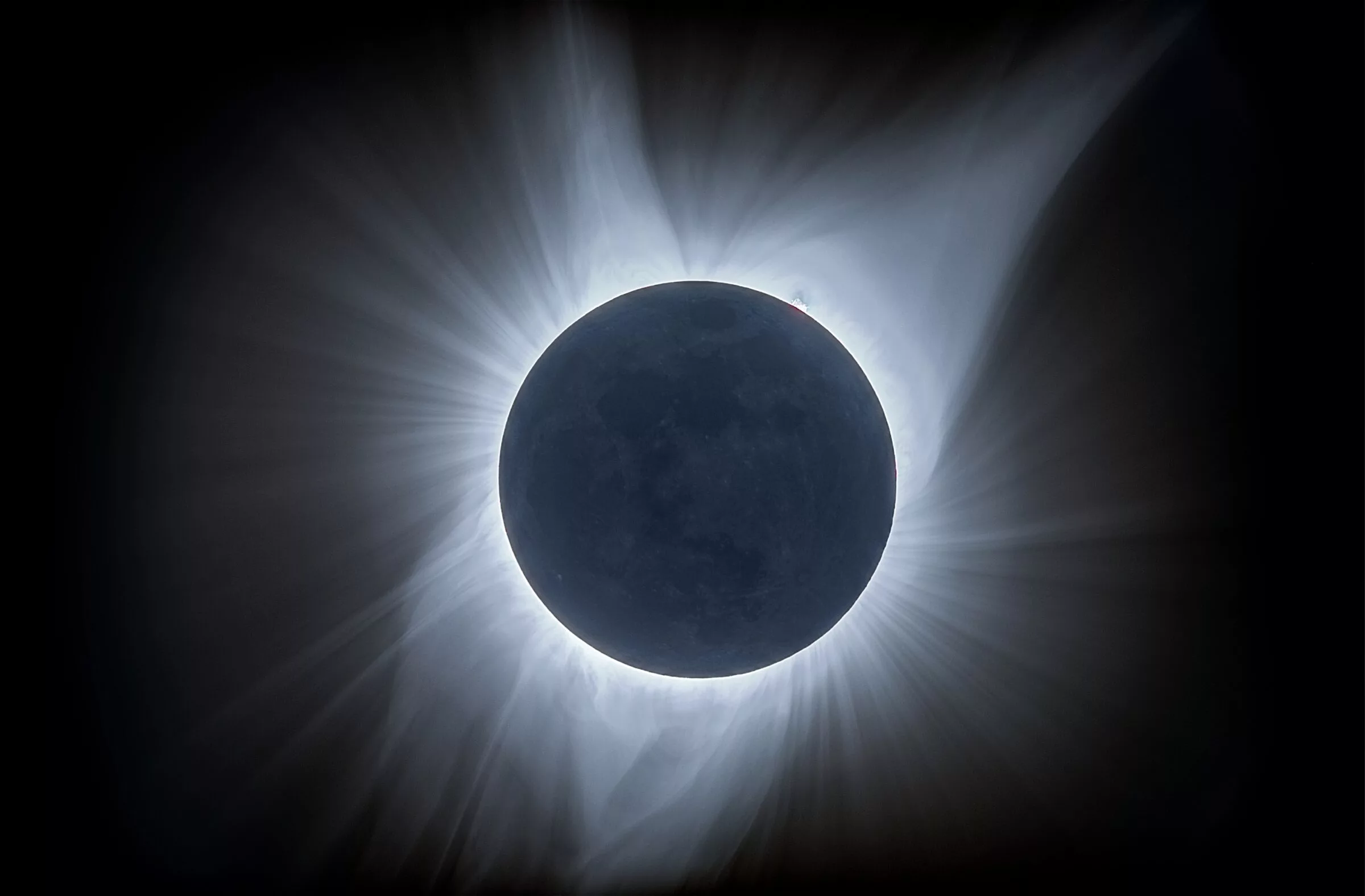 Eclipse Solar Total de 2017: O eclipse solar total de 21 de agosto de 2017 capturou a atenção de milhões de pessoas ao cruzar os Estados Unidos. Esta imagem do eclipse durante a totalidade, tirada em Douglas, Wyoming, captura a corona solar do nosso Sol com detalhes impressionantes. Eclipses solares totais oferecem uma oportunidade única para estudar a atmosfera solar sem a necessidade de coronógrafos espaciais. Imagem: Blake Estes